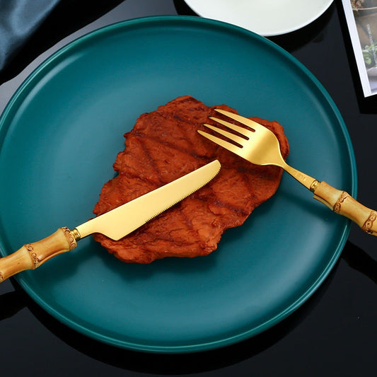 4pcs Gold Bamboo Handle And Steel Tableware Cutlery For Luxury Dinnerware Set